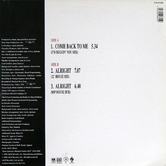 Janet Jackson - Come Back To Me / Alright (12", Single, Ltd, Pos) (Very Good Plus (VG+))