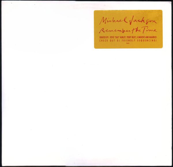 issued in a gatefold generic white cover with a yellow and red hype sticker stating: "Michael Jackson Remember The Time Remixes By: Steve "Silk" Hurley, Teddy Riley, E-Smoove And Maurice! Check Out DJ Friendly Sequencing! E2S 4453 S1" Catalog number on labels are EAS 4454 and EAS 4455. Labels have printed "Demonstration Only - Not For Sale" at bottom.