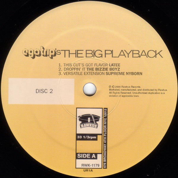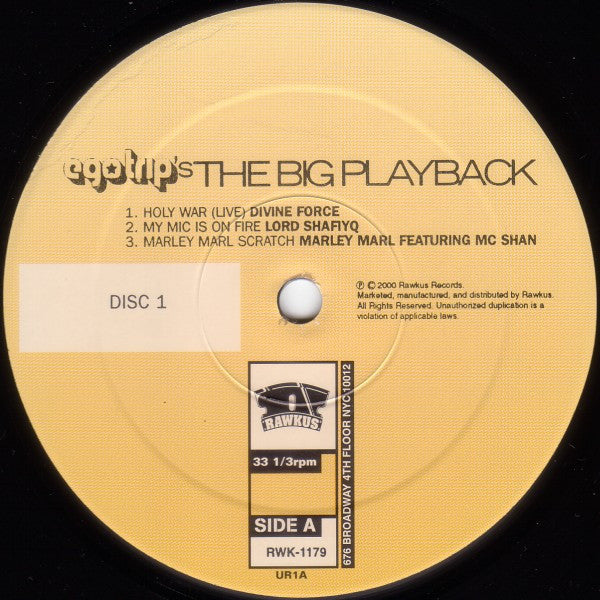 2nd edition with Supreme Nyborn's "Versatile Extension" replacing Rammelzee Vs. K-Rob's "Beat Bop." Full title: Egotrip's The Big Playback (The Soundtrack to Ego Trip's Book of Rap Lists). Includes a sheet with all Credits, some Photos and a little Story about the Book & the featured Rappers. "Land That Time Forgot" photographed on location by Leslie de la Vega at The Monkey Academy, New York City, February 3, 2000. "Holy War" original issue Yamak-ka 12" #YA-01, 1987. "My Mic Is On Fire" original issue NUWR 12" #AZ-007, 1987. "Marley Marl Scratch" original issue Nia 12" single #1248, 1985. "Get Retarded" original issue Fresh 12" single #80121Y, 1988. "Get Down Grandmaster" original issue Tuff City 12" single #128021, 1988. "Step Up Front" original issue First Priority 12" single #D-96621, 1988. "This Cut's Got Flavor" original issue Wild Pitch 12" single #1003, 1987. "Droppin' It" original issue Payroll 12" single #733, 1989. "Versatile Extension" original issue Payroll 12" single #732, 1988. (cat# from discogs as it's missing on info sheet) "I'm Not Playing" original issue Strong City 12" single #UNI-8014, 1989. "Do It! Do It!" original issue First Priority 12" single #FPM 2941, 1987. "Brooklyn Blew Up The Bridge" original issue Ski 12" single #SP-1116, 1987 (as M.C. Mitchski "The Rappin Comedian" and M.B. "The Human Radio"). All songs remastered at Frankford-Wayne Mastering Labs Inc., NYC.